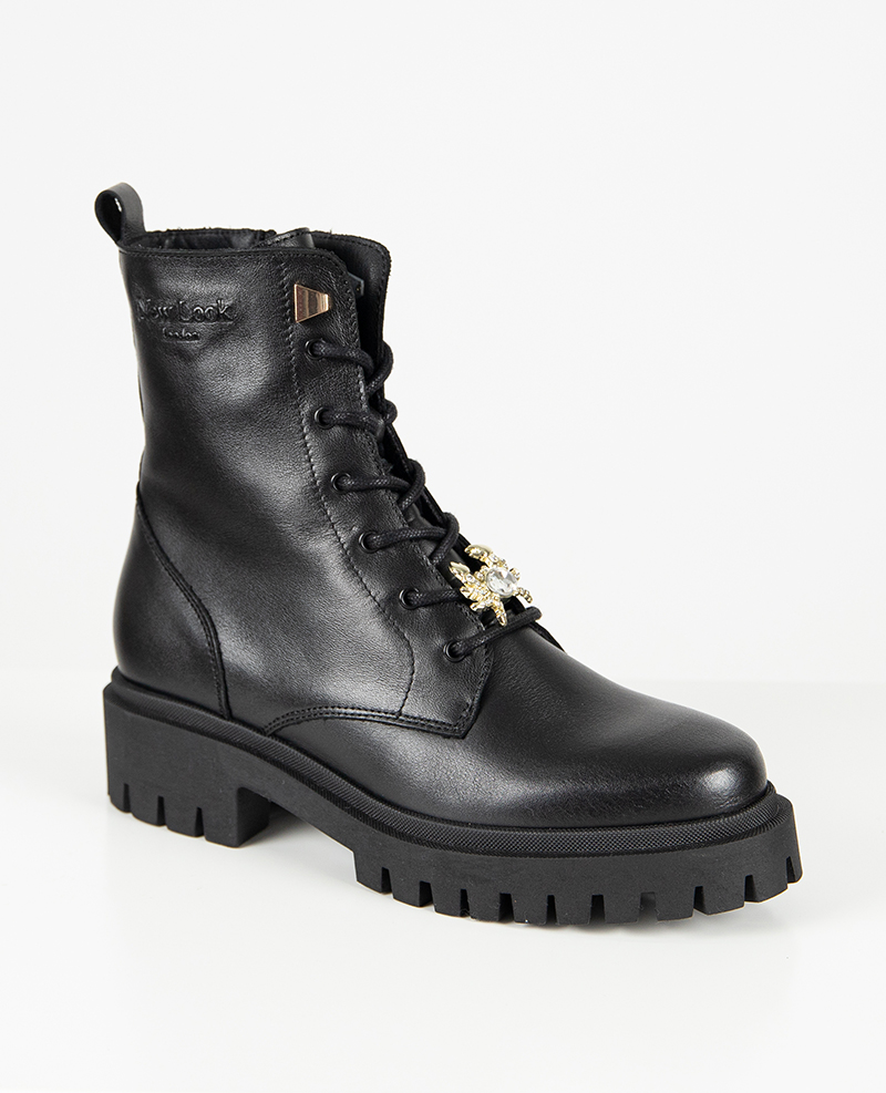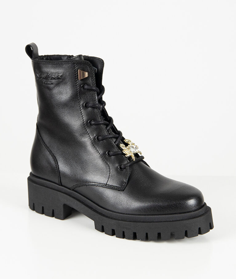 Botins rasos, de senhora com detalhe em aplicação em brilhantes na zona dos cordões .