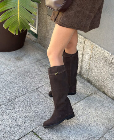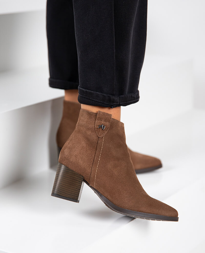 Botim salto alto, de senhora com detalhe em aplicação na lateral exterior.