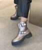 Botins rasos, de senhora com detalhes em fivelas na lateral .