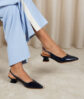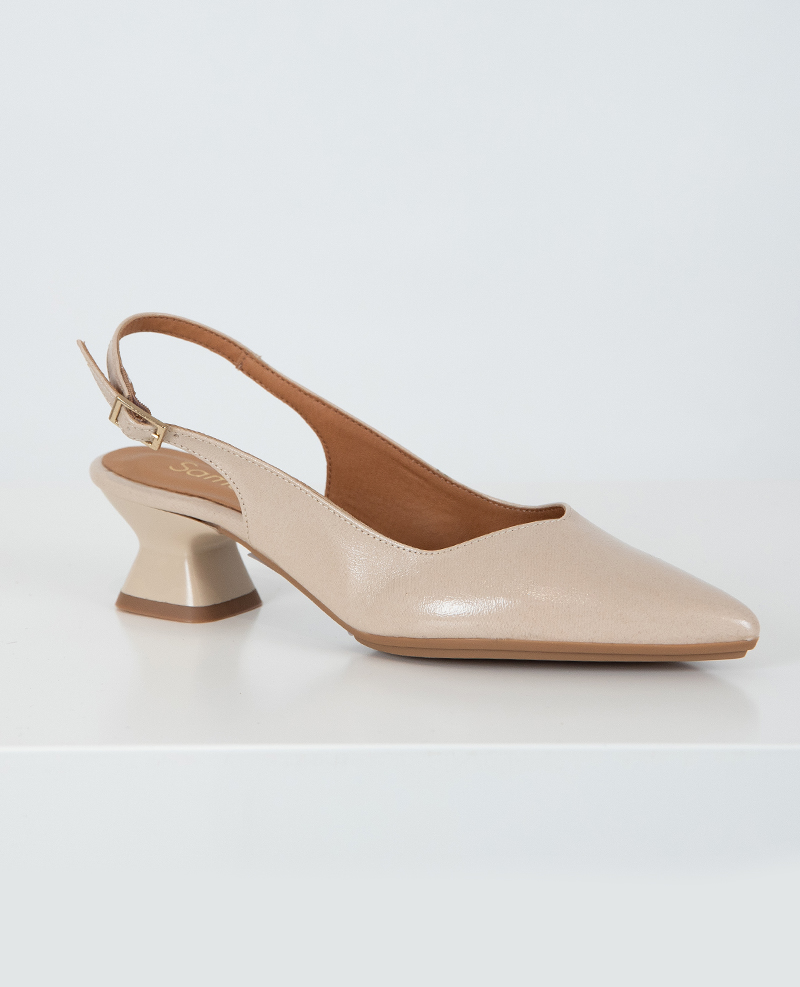 Sapato de senhora, semi-aberto modelo pontiagudo salto irregular.