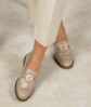 Sapatos rasos, de senhora, com detalhe de aplicação dourada no peito do pé .